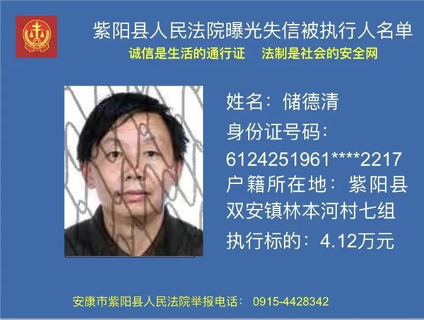 被執(zhí)行人儲德清,你因不履行(2017)陜0924民初241號民事判決書確定的義務(wù),已被紫陽縣人民法院納入失信被執(zhí)行人名單庫依法進行信用懲戒。信用懲戒范圍包括但不限于以下措施:
