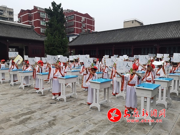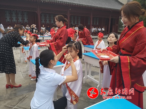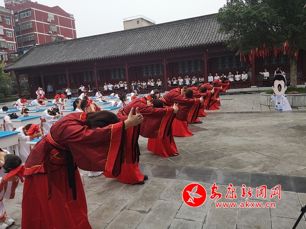 據(jù)了解,“開筆禮”是中國古代人生“四大禮”之首,是蒙童入學階段極為重要的儀式。“開筆禮”儀式主要分成六項內(nèi)容,每一項內(nèi)容承載著特定的教育目的。“正衣冠”要求學子們養(yǎng)成干凈整潔的生活習慣;“感恩鞠躬”讓學子向師長行揖禮,謝師恩、謝親恩,并為師者和長輩奉茶,讓他們從小懂得孝親尊師的道理;“凈手凈心”讓學子們從此靜心讀書,心無旁騖;“朱砂啟智”,表達了師長對學子們的美好祝愿,希望他們心明眼亮,聰慧過人;“擊鼓明志”讓學子們樹立遠大的理想與目標;“開筆啟蒙”書寫“人”字,學會做人的道理。蒙童通過親身經(jīng)歷這種莊嚴古樸的儀式,實現(xiàn)從蒙童到學生的心理過渡。
