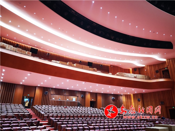 大廳右側(cè)為大劇場(chǎng),左側(cè)為小劇場(chǎng)。大劇場(chǎng)的舞臺(tái)長(zhǎng)33.6米,高24.2米,舞臺(tái)正前方配有一個(gè)長(zhǎng)14.3米、寬13.3米的升降舞臺(tái),劇場(chǎng)內(nèi)可同時(shí)容納1200人觀看演出。小劇場(chǎng)舞臺(tái)長(zhǎng)18.3米,高11.3米。共有座位307個(gè),內(nèi)部設(shè)施安裝已基本完成。