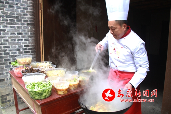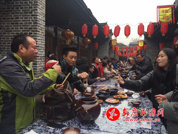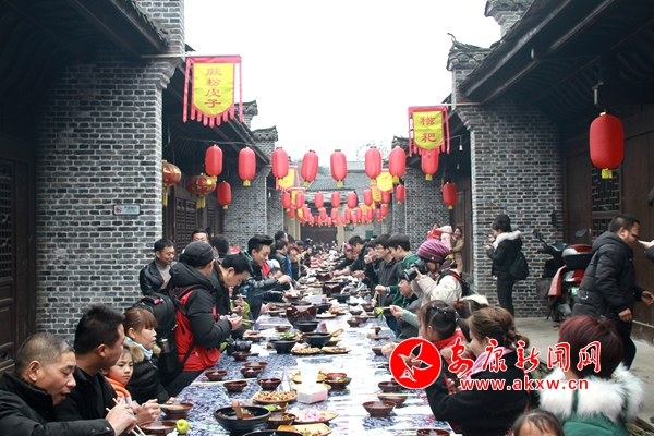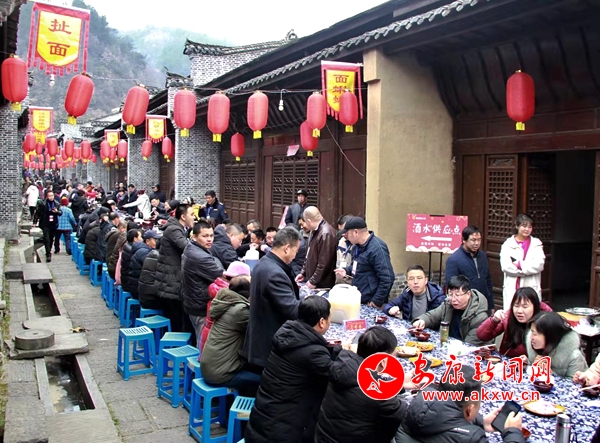 為讓各地游客品嘗到美味的漢陰名小吃,活動(dòng)現(xiàn)場(chǎng)還舉辦了富硒美食品鑒活動(dòng)。游客可通過(guò)競(jìng)猜答題、幸運(yùn)抽獎(jiǎng)等方式,參與品嘗漢陰特色美食,零距離感受陜菜之鄉(xiāng)的文化氣息。在人氣爆棚的古鎮(zhèn)長(zhǎng)桌庖湯宴上,百米長(zhǎng)桌,游客相對(duì)而坐,特色泥碗盛滿香甜美酒,當(dāng)?shù)赜慰鸵云洫?dú)特的“陜南酒拳”與親朋“切磋”助興。本次庖湯宴包含6個(gè)地方?jīng)霾恕?0個(gè)特色熱菜和2個(gè)養(yǎng)生燉菜,“金豬送福”、“肝膽香爪”、“翡翠白菜”......一道道精心準(zhǔn)備的菜肴讓各地游客既感心意、又獲暖意。現(xiàn)場(chǎng)參與庖湯宴的游客不僅能享用美食,還能獲贈(zèng)新春對(duì)聯(lián)一副,收獲滿滿的古鎮(zhèn)祝福。