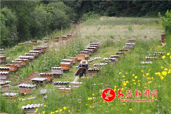 “那個就是老余,我們村中華蜂養(yǎng)殖園和養(yǎng)蜂農(nóng)民專業(yè)合作社的負責人......”順著營盤埡村支部書記劉賜堂手指的方向望去,只見一位頭戴防蜂面罩,身著格子襯衣的中年漢子正在花叢中整理蜂箱。
