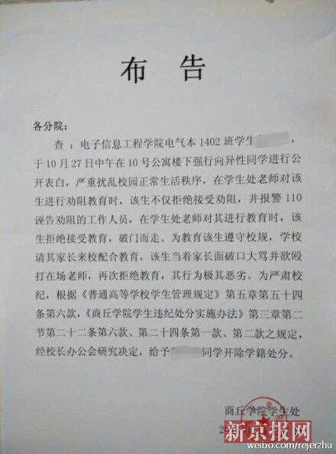 新京報快訊(記者 程媛媛 實習(xí)生 顧開貴 趙吉翔)今日(11月10日),河南商丘學(xué)院一份“布告”在網(wǎng)上流傳,“布告”稱該校男生郭某“強行”向異性表白,嚴(yán)重擾亂校園秩序,校方依據(jù)相關(guān)規(guī)定給予郭某開除學(xué)籍處分。該校多名學(xué)生向新京報記者證實校內(nèi)多個分院均貼有此布告。