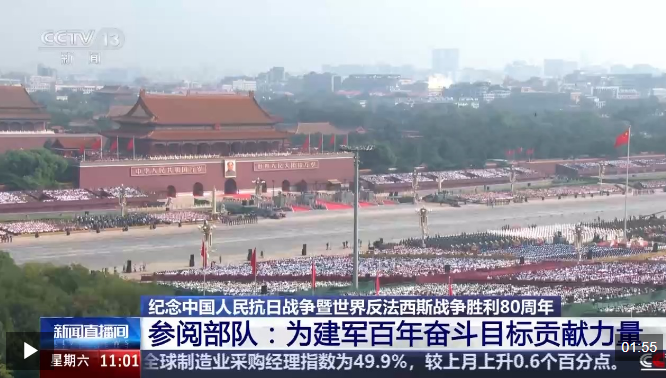 紀(jì)念中國(guó)人民抗日戰(zhàn)爭(zhēng)暨世界反法西斯戰(zhàn)爭(zhēng)勝利80周年大會(huì)9月3日隆重舉行。受閱部隊(duì)作為共和國(guó)武裝力量的代表,光榮接受了黨和人民的檢閱。中央軍委主席習(xí)近平簽署通令,嘉獎(jiǎng)參閱全體人員。廣大參閱官兵備受鼓舞,一致表示,一定不負(fù)習(xí)主席重托,為如期實(shí)現(xiàn)建軍一百年奮斗目標(biāo)、加快把人民軍隊(duì)建成世界一流軍隊(duì)不懈奮斗。
