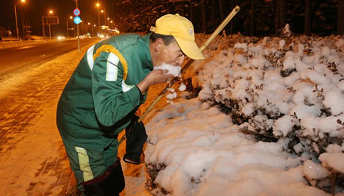 12月7日,遼寧大連,環(huán)衛(wèi)工王喜義夫婦整整除雪17個(gè)小時(shí)。衣服被打濕,飯也來(lái)不及吃,只能抽空啃幾口饅頭;渴得實(shí)在受不了,他們會(huì)吃雪解渴!拔覑廴四脪咧銙叩郎稀