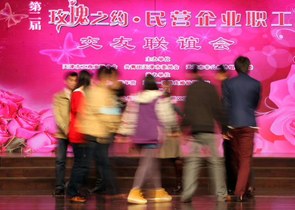 11月10日,前來(lái)相親的青年男女手牽手參與互動(dòng)游戲——“桃花朵朵開(kāi)”。當(dāng)日,天津市“第二屆玫瑰之約·民營(yíng)企業(yè)職工交友聯(lián)誼會(huì)”在天……