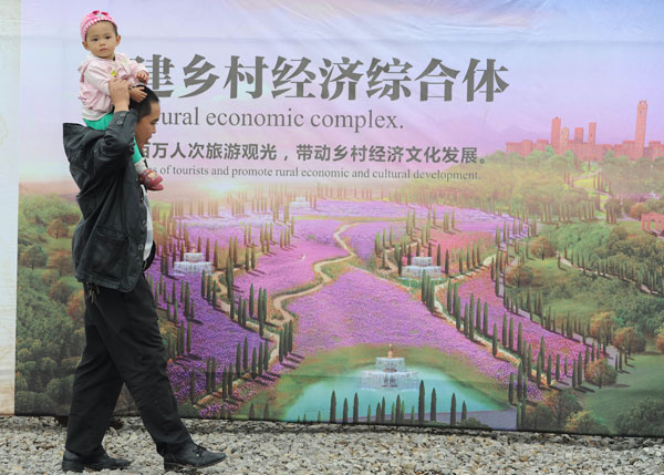 10月22日,重慶市渝北區(qū)興隆鎮(zhèn),當?shù)卮迕駧е『⒃诘旎鶅x式現(xiàn)場參觀效果圖。當日,重慶“五谷地意大利休閑度假農(nóng)場”正式破土動工。該項目按照意大利風格設計,……