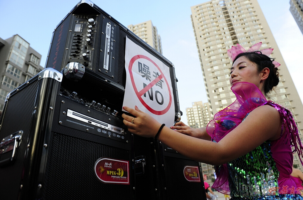 昨晚7時許,西安市未央?yún)^(qū)百花家園小區(qū),眾多廣場舞愛好者一起向廣場舞的音箱貼標(biāo)語,向噪音說“No”。