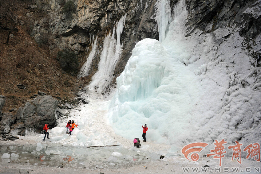 昨日下午2時許,在戶縣澇峪黑山瀑布下,近百名游客在冰凍瀑布下爭相拍照留念。這些游客大多來自西安、咸陽、銅川等地,多是“慕名而來”。“今年是第二次來,還帶上了我媳婦。”咸陽的王先生說。