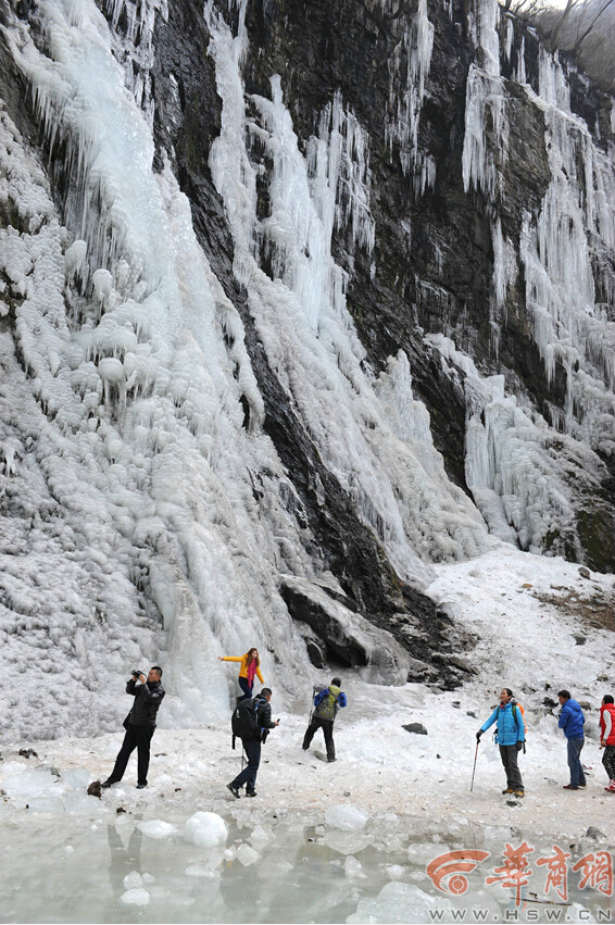 昨日下午2時(shí),游客在戶(hù)縣澇峪黑山瀑布前合影留念。不時(shí)有冰塊從瀑布上方掉落,著實(shí)讓人捏了一把汗 記者 趙彬 攝iks安康新聞網(wǎng)