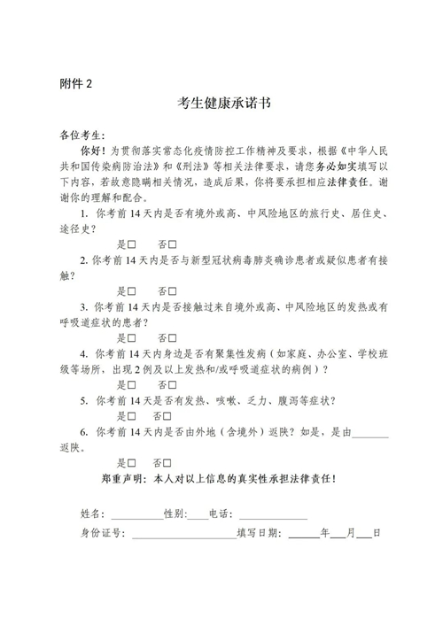 健康監(jiān)測(cè)。考生在高考前14天到高考結(jié)束應(yīng)進(jìn)入靜態(tài)管理,堅(jiān)持做到非必要不流動(dòng),不到人群流動(dòng)性較大的場(chǎng)所活動(dòng),不接觸有疫情風(fēng)險(xiǎn)的人員,做好每日體溫測(cè)量、記錄并進(jìn)行健康狀況監(jiān)測(cè),填寫《陜西省高考考生健康狀況登記卡》(附件1)和《考生健康承諾書》(附件2)。考生健康如出現(xiàn)異常狀況應(yīng)立即向?qū)W校和高考報(bào)名地考試機(jī)構(gòu)報(bào)告,不得謊報(bào)、瞞報(bào)。