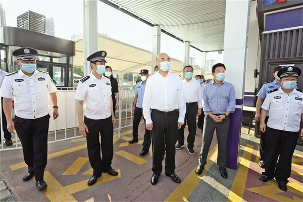 7月9日,省委書(shū)記劉國(guó)中到西安市調(diào)研檢查重點(diǎn)行業(yè)運(yùn)行保障工作并看望高溫下的一線(xiàn)工作人員。圖為在西安繞城高速公路曲江出口檢查站,劉國(guó)中看望執(zhí)勤民警和疫情防控工作人員。記者 張辰攝