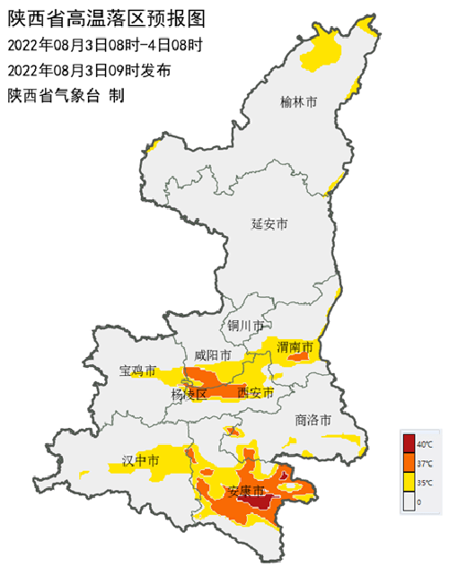 2022年8月3日10時(shí)00分,陜西省氣象臺(tái)發(fā)布高溫黃色預(yù)警 :受大陸高壓影響,3日榆林北部、關(guān)中大部、陜南大部地方有35℃以上的高溫天氣,其中咸陽南部、楊凌、西安大部、渭南南部、漢中東部、安康部分地方可達(dá)37℃以上,安康平原地區(qū)局地可達(dá)40℃以上。