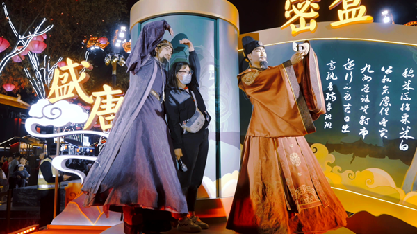 “《西游記》中九九八十一難,第一難是什么?”“不知道,不要緊,來(lái),拍個(gè)照。”夜色漸濃,西安市大雁塔下的大唐不夜城華燈熠熠,流光溢彩。兩位身著古裝的演員,分別扮演唐代名人房玄齡和杜如晦,出題與游客進(jìn)行互動(dòng),幽默風(fēng)趣的提問(wèn)和回答引得臺(tái)下觀眾不時(shí)發(fā)出陣陣歡笑。