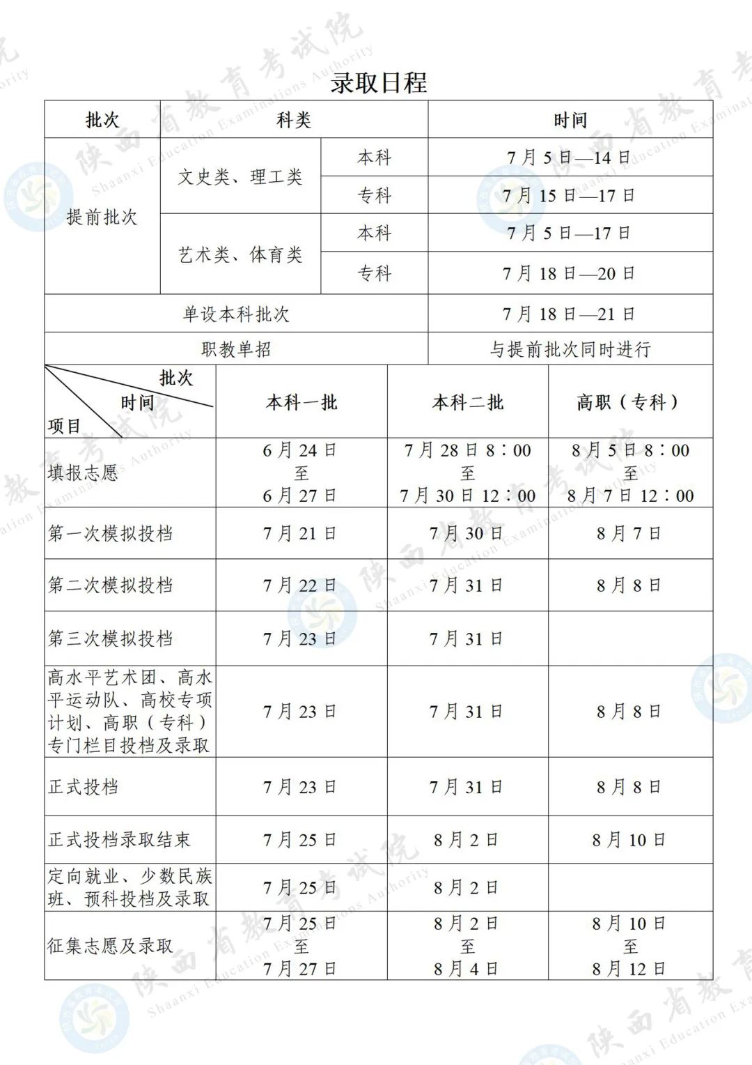 今年陜西省高考錄取日程安排如下: