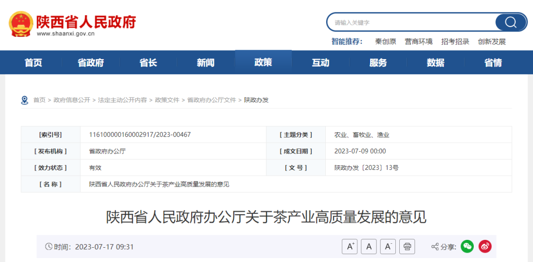 陜西省人民政府辦公廳關(guān)于茶產(chǎn)業(yè)高質(zhì)量發(fā)展的意見(jiàn)