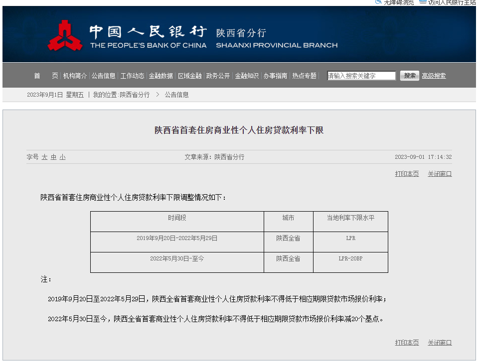 中國人民銀行陜西省分行注明,2019年9月20日至2022年5月29日,陜西全省首套商業(yè)性個人住房貸款利率不得低于相應(yīng)期限貸款市場報價利率;2022年5月30日至今,陜西全省首套商業(yè)性個人住房貸款利率不得低于相應(yīng)期限貸款市場報價利率減20個基點。