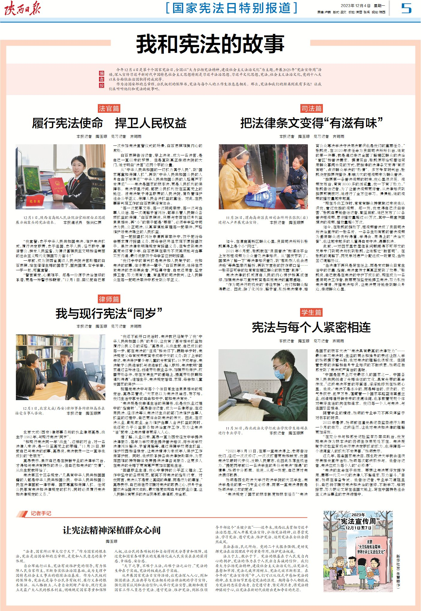 從開展國家憲法日宣傳活動,讓憲法深入人心,到加強國旗法、民法典等與憲法相關(guān)的法律法規(guī)的學(xué)習(xí)宣傳,強化國家認(rèn)同和法治信仰;從舉行憲法宣誓,激勵和教育國家工作人員忠于憲法、遵守憲法、維護(hù)憲法,到抓住領(lǐng)導(dǎo)干部這個“關(guān)鍵少數(shù)”……近年來,陜西認(rèn)真貫徹習(xí)近平法治思想,深入開展憲法宣傳,弘揚憲法精神,讓尊崇憲法、學(xué)習(xí)憲法、遵守憲法、維護(hù)憲法、運用憲法在全社會蔚然成風(fēng)。