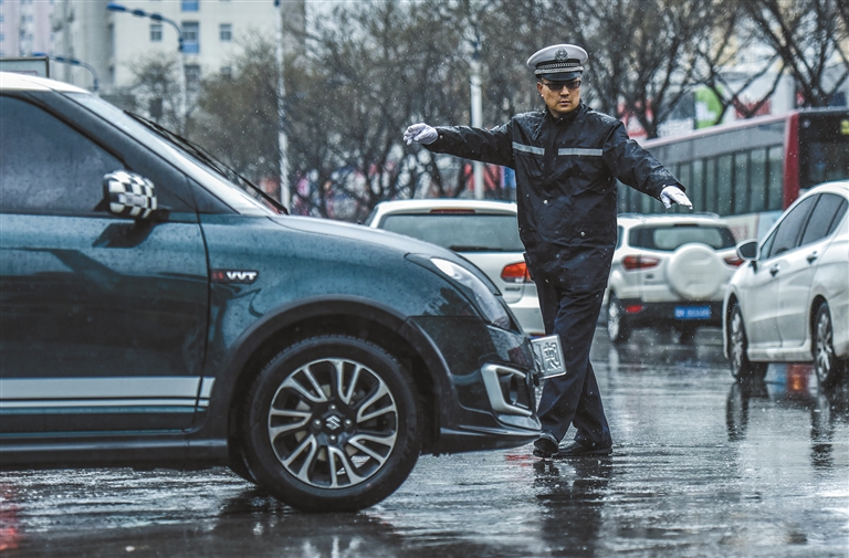 榆林市公安局交警支隊(duì)民警郭勇在雨中指揮交通(資料照片)。 受訪者供圖