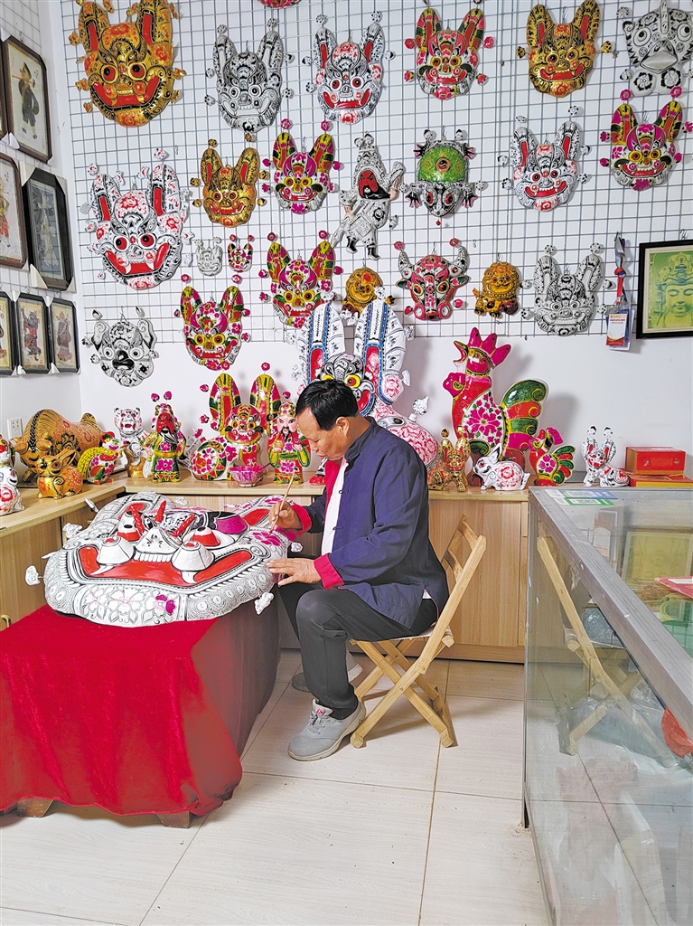 2023年12月31日,寶雞市鳳翔區(qū)城關(guān)鎮(zhèn)六營村處處彰顯著濃郁的民俗文化韻味。記者跟隨胡滿科走進(jìn)他的泥塑工坊,只見墻上掛滿了臉譜、虎頭、牛頭等掛片泥塑,桌子上的立人泥塑栩栩如生;幾名村民分散坐在屋內(nèi),專注于自己的那道工序。