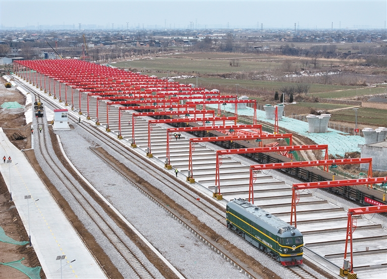 1月21日,中鐵十一局西延高鐵閻良鋪軌基地(無人機照片)。 當日,隨著一列運載500米長鋼軌的列車駛入中鐵十一局西延高鐵閻良鋪軌基地,西(安)延(安)高鐵進入存軌施工階段,為后續(xù)鋪軌工作奠定基礎。項目建成后,西安至延安的運行時間將從目前的2.5小時縮短至1小時左右。 新華社記者 張博文攝