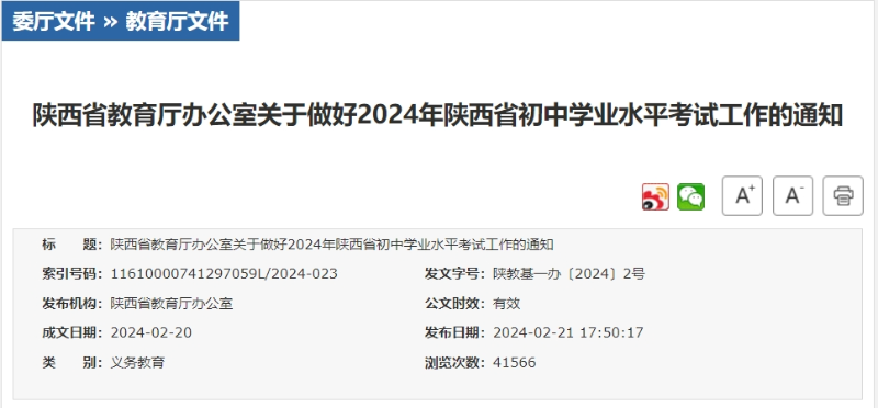 2月21日記者從陜西省教育廳獲悉,2024年陜西省初中學(xué)業(yè)水平考試工作相關(guān)安排出爐,對考試對象、考試科目、各科目試卷滿分值及考試時長等做了明確。突出學(xué)生綜合素質(zhì)的考查,并通過優(yōu)化命題形式,引導(dǎo)減少死記硬背和“機械刷題”。任何單位與個人不得根據(jù)初中學(xué)業(yè)水平考試成績給學(xué)校和學(xué)生排隊或以任何形式公布名次。