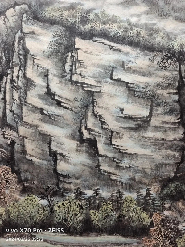 我曾多次到溪山,也幾次陪同中國(guó)美協(xié)的寫生團(tuán)到此寫生。我感到,周圍的大山里,很難找到范寬畫作里的溪山原型,因此我認(rèn)為范氏畫山不是山,他是畫心中的溪山。讓我更加感到困難的是,雄偉且飽滿的溪山,是丹霞層巖山形,它如巨碑一樣高聳,如果用中國(guó)畫的表現(xiàn)手法去表現(xiàn),無論采用什么樣的技法,都很難描繪它的特點(diǎn),畫不好就容易僵硬而毫無生氣,這恰恰是令我生畏的地方。