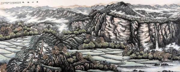 基于這樣的思考,一幅溪山作品的構(gòu)圖在腦海漸漸形成,它將是一幅以綠色為基調(diào)的青山綠水圖畫,是人與自然和諧共生的美麗情愫。全畫由近、中、遠(yuǎn)三部分構(gòu)成,以平視和仰視的角度分別體現(xiàn)。近景畫出幾塊巨大嶙峋的山石,配以年輪久遠(yuǎn)的古松和新植的翠松。背后是暮春的梯田、村落,小河邊有洗衣的婦女和在田間勞作的人們。這些符號(hào)結(jié)合在一起,所要表現(xiàn)的就是時(shí)空久遠(yuǎn)與現(xiàn)實(shí)的延伸,人與自然依然和諧共生共榮,增加現(xiàn)代生活氣息;中景突出巨碑式的丹霞層巖,巖上飛流而下的飛瀑,表現(xiàn)溪山的巍峨與壯觀,這是全畫中必須用心刻畫的細(xì)節(jié)。溪山的厚重、峻峭,都要通過有力的線條表現(xiàn)出來,增強(qiáng)溪山的氣勢(shì)和偉岸,但又要注意不能給人以壓抑感,要以云遮霧掩顯現(xiàn)它的神奇和神秘;遠(yuǎn)景是大山背后的遠(yuǎn)山層巒,分三層漸次疊加。最上一層是春暉映照的暖色遠(yuǎn)山,對(duì)整個(gè)的冷色基調(diào)形成對(duì)比和映襯,使畫面不至于過于沉郁?傊,我要表現(xiàn)的是春色之中磅礴而壯麗的溪山。