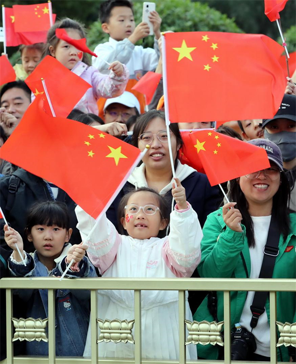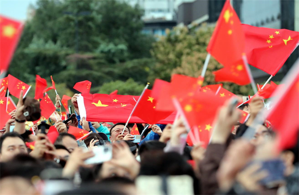 隨后,在《歌唱祖國(guó)》的奏樂中,人們揮舞著手中的國(guó)旗,盡情唱響愛國(guó)贊歌,表達(dá)愛國(guó)之情。