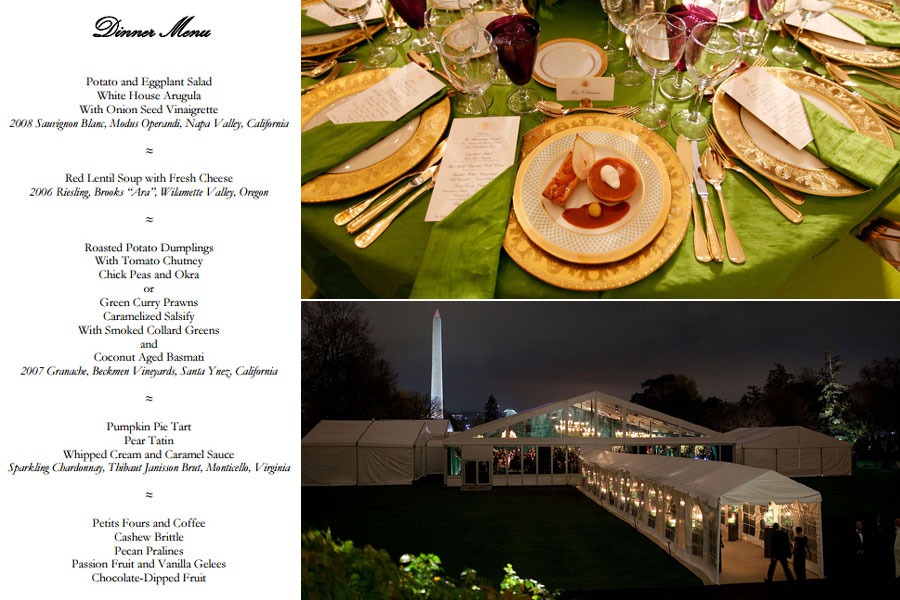 國宴的菜單是精心選定的,其中專門為素食主義者辛格準備了鮮美素食。宴會菜譜主打印度和美國時令菜肴,頭道菜是土豆和茄子沙拉。甜點有南瓜餡餅、涂有生奶油和焦糖淋醬的梨撻,每道甜點都會配有不同口味的紅酒。