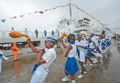 | 圖為當(dāng)?shù)孛癖姎g迎到訪的和平方舟醫(yī)院船。 |