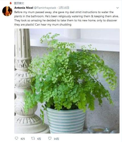 英國(guó)女消防員尼科爾近日在推特上發(fā)文寫道:“家母離世前曾留下嚴(yán)格指示,要我爸爸為浴室內(nèi)的植物澆水。他定期澆水灌溉,它們很漂亮,他搬家時(shí)決定一起帶走,卻發(fā)現(xiàn)它們是塑料的!我彷佛聽(tīng)到媽媽正在咯咯地笑!