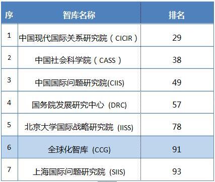 中國現(xiàn)代國際關(guān)系研究院、中國社會科學(xué)院等七個中國智庫上榜,其中,CCG上榜2017年全球頂級智庫百強榜單第91位,成為中國首個入選世界百強的社會智庫。