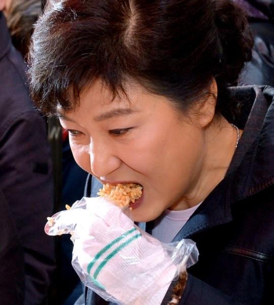 2012年11月,總統(tǒng)候選人樸槿惠現(xiàn)身傳統(tǒng)市場(chǎng),購(gòu)買(mǎi)糕點(diǎn)并品嘗。