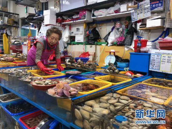 圖為韓國釜山札嘎其水產(chǎn)市場內(nèi)一家貝類水產(chǎn)攤位。新華社記者 耿學鵬 攝