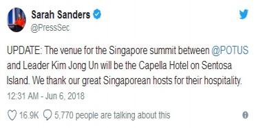 人民網(wǎng)北京6月6日電(姚麗娟) 美國總統(tǒng)特朗普與朝鮮最高領導人金正恩的首次會面將于6月12日在新加坡舉行。美國白宮5日公布了美朝領導人會晤的……