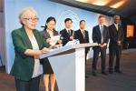 塞罕壩第一代務(wù)林人代表陳彥嫻(左一)在頒獎晚會上發(fā)表獲獎感言
