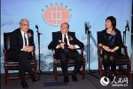 莫里斯·格林伯格先生(中)與中國駐紐約總領事章啟月大使(右)和耶魯大學校長彼得·沙洛維(左)就中美關系進行對話。(圖片由主辦方提供) ……