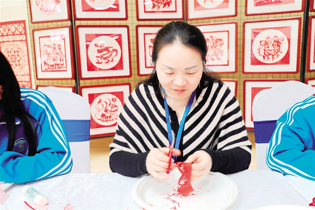 走進張莉的課堂里,滿目色彩繽紛的剪紙作品,大大小小地陳列在展臺處。整整齊齊的桌凳圍成一個個不同形狀,以便于學(xué)生更好地進行交流。她用學(xué)生通俗易懂的語言為學(xué)生傳授剪紙技巧:“同學(xué)們,我們首先把需要用的彩紙對折接著裁剪出合適的大小。然后再描出自己想要剪出的形狀……”通過紙張在指尖來回翻轉(zhuǎn),手中的剪刀“咔嚓咔嚓”,一幅幅美輪美奐的作品便呈現(xiàn)在眼前。每周張莉都要給學(xué)生們上幾節(jié)美術(shù)課,這也讓很多學(xué)生對剪紙產(chǎn)生了濃厚的興趣,創(chuàng)造出很多優(yōu)秀作品。