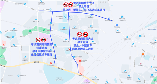 1、花園大道(安康大道至世紀(jì)大道)、世紀(jì)大道(新路口環(huán)島至五路口環(huán)島)、高新四路,所有通行車(chē)輛于6月6日21時(shí)至6月8日21時(shí),無(wú)論遇到何種情況,一律禁止鳴笛,禁止大中型貨車(chē)、;愤\(yùn)輸車(chē)通行。