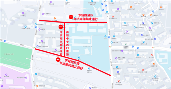 高新中學(xué)所處的學(xué)苑路東段、永定路全段、高新中學(xué)西側(cè)道路進(jìn)行交通管制,禁止所有車(chē)輛通行。