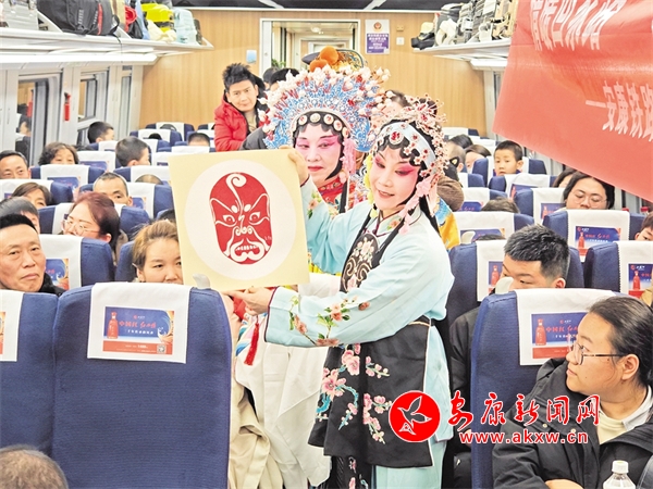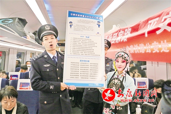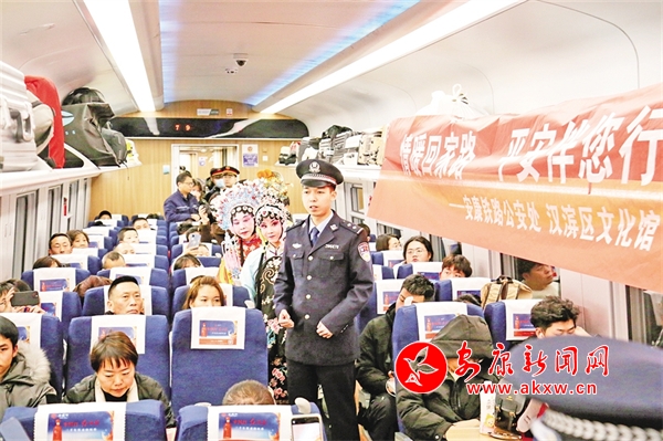 火車穿越秦巴山水間,途中,來自安康漢調(diào)二黃研究院的專業(yè)演員和地方民間漢調(diào)二黃愛好者們一同表演了國家級非物質(zhì)文化遺產(chǎn)——漢調(diào)二黃經(jīng)典戲曲演唱,并為旅客們講解漢調(diào)二黃戲曲知識,與旅客們開展互動交流,讓旅客親身體驗漢調(diào)二黃戲服道具,感受漢調(diào)二黃的獨特藝術(shù)魅力。來自漢濱區(qū)文化館的漢濱剪紙技藝傳承人為旅客們展示講解了安康市級非物質(zhì)文化遺產(chǎn)——漢濱剪紙技藝,向參與互動的旅客送上了親手創(chuàng)作的漢濱剪紙作品,提前送上新春祝福;顒又校靼茶F路公安局安康公安處的民警們和文藝工作者們一同宣傳普及了反詐知識,進一步提升旅客的安全防范意識。