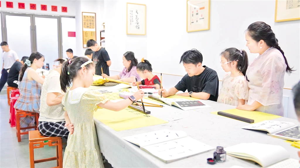 “我們來看下這‘海’字,是左右結構的字,左邊的偏旁是一個三點水,三點水寫的時候要注意連貫性……”書法老師細致地拆解著漢字的書寫技巧,耐心指導著現(xiàn)場的每一位學員。