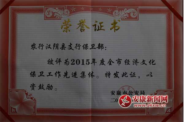 安康新聞網(wǎng)訊 (通訊員 吳玄杰)近日,陜西省公安廳、省綜治委聯(lián)合下發(fā)了《關(guān)于命名表彰2015年度全省經(jīng)文保系統(tǒng)省級“平安示范單位”“平安單位”的決定》,農(nóng)行漢陰縣支行被授予省級“平安單位”榮譽稱號。同時,安康市公安局下發(fā)了《安康市公安局關(guān)于表彰2015年度全市經(jīng)濟文化保衛(wèi)工作先進集體和先進個人的決定》,農(nóng)行漢陰縣支行保衛(wèi)部獲得“2015年度全市經(jīng)濟文化保衛(wèi)工作先進集體”榮譽稱號,保衛(wèi)部經(jīng)理鄺吉祥同志被市公安局評為“先進個人”。
