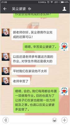 學(xué)校建立了學(xué)生德育成長檔案,對“德育作業(yè)”實(shí)行“學(xué)生自我評價(jià)、家長評價(jià)、老師評價(jià)”三級評定制度。按照完成情況實(shí)行等級評價(jià),每級評定最低可給一顆星,最多可給五顆星,德育作業(yè)完成情況實(shí)行一周一評定,一學(xué)期一匯總,根據(jù)德育作業(yè)完成情況年終評選星級少年。各班主任與學(xué)生家長建立了微信群,在交流學(xué)生學(xué)習(xí)情況的同時(shí),家長還通過微信群及時(shí)向老師反饋“德育作業(yè)”完成情況和評價(jià)結(jié)果。