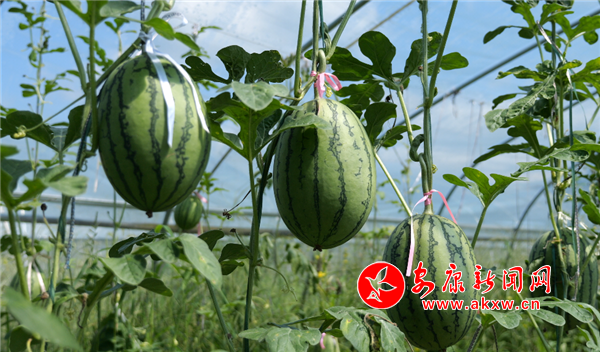 走進西瓜大棚,放眼望去,郁郁蔥蔥的瓜蔓蜿蜒向上,長勢旺盛,一個個油亮亮、圓滾滾的西瓜懸掛在藤蔓上。