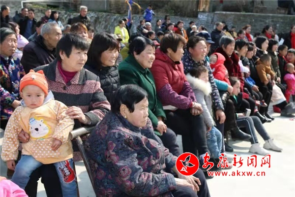這場"幸福都是奮斗出來的"新民風(fēng)文藝演出在唐灣村"百姓大舞臺(tái)"拉開帷幕,節(jié)目舞蹈《開門紅》《祝福祖國》《幸福安康》;眉戶劇《梁秋燕》;快板《說唱安康新民風(fēng)》;小品《豬八戒背媳婦》《幸福一家人》;小戲《黃四姐》;表演唱《大家喜歡》《逛唐灣》《五只小船》《龍船調(diào)》;二人轉(zhuǎn)《小拜年》;黃梅戲《夫妻觀燈》;道情《毛驢》等深受群眾喜愛,節(jié)目精彩紛呈,現(xiàn)場處處洋溢著歡樂祥和的氣氛,給觀看演出村民帶來了一場視聽盛宴。村民唐志海說:"我在漢中創(chuàng)業(yè)多年,今天觀看了這場勵(lì)志文藝演出,節(jié)目實(shí)惠、通俗易懂、很接地氣"。村黨支部書記唐志亮說:"唐灣村是全市第一年已脫貧村,通過黨建引領(lǐng)新民風(fēng)建設(shè),大力弘揚(yáng)誠、孝、儉、勤、和,遵紀(jì)守法、精神文明建設(shè),精準(zhǔn)扶貧工作著力扶貧扶志、美麗生態(tài)鄉(xiāng)村、族規(guī)家訓(xùn)、經(jīng)濟(jì)發(fā)展等讓村民的幸福指數(shù)不斷提升,日子越過越紅火"。八十五歲高齡退休教師唐祖勝說:"過去村里逢年過節(jié)放電影、玩彩船、;瘕垼幕钬S富的很?稍谧罱鼛啄晡幕麄骰顒(dòng)少了,閑人聚在一起就是打牌賭博,讓農(nóng)村社會(huì)風(fēng)氣變了樣,今年政府倡導(dǎo)禁止煙花爆竹燃放,所以百姓大舞臺(tái)文藝演出便成了一種新時(shí)尚。.