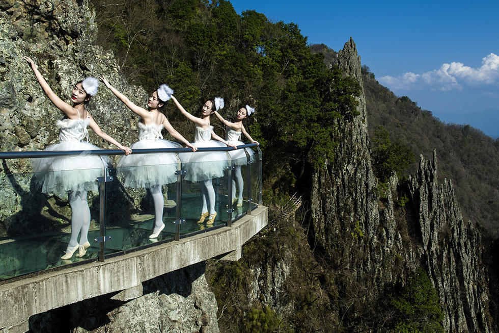 在懸崖絕壁的玻璃棧道上,芭蕾演員們身著潔白的芭蕾服,腳踩透明玻璃,隨著音樂的響起,她們跳出各種唯美的芭蕾舞動作。美麗險峻的山峰,輕巧婀娜的舞姿,將空中芭蕾與山的險奇有機結合,給春天里的南宮山再添了幾分美景。達人們紛紛走到玻璃棧道,用手中的相機留念拍照,與粉絲們暢談著 “空中漫步”,低頭俯瞰綿延山川的絕色美景。