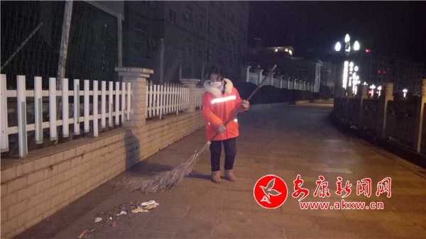 圖為環(huán)衛(wèi)工人吳志美大年初一、初五凌晨街上空無(wú)一人的時(shí)候,她默默的在清掃大街小巷(筆者晨練偶遇隨拍), 他用一身寒霜溫暖縣城清晨!