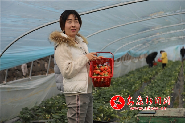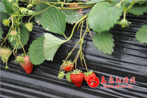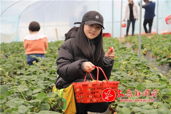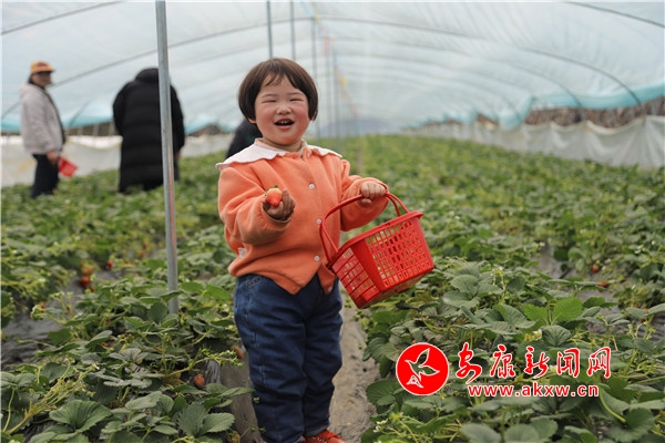 “媽媽,這里的草莓真得好甜!”一個剛進大棚里采摘的小朋友欣喜地喊著。