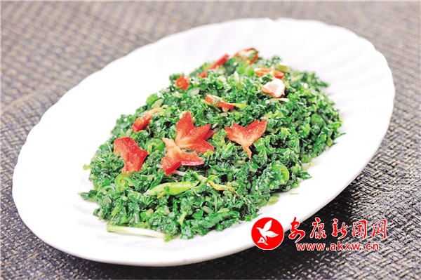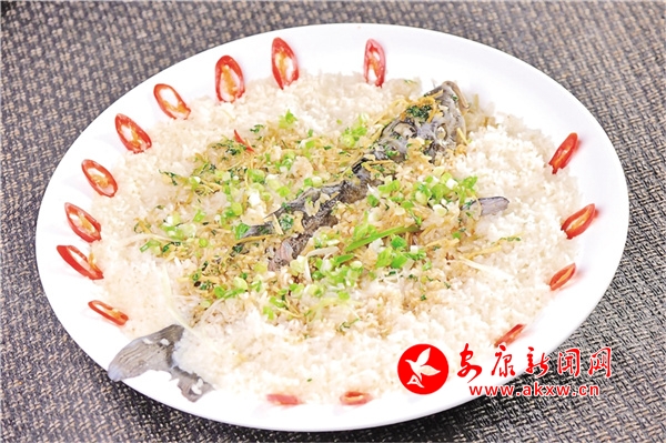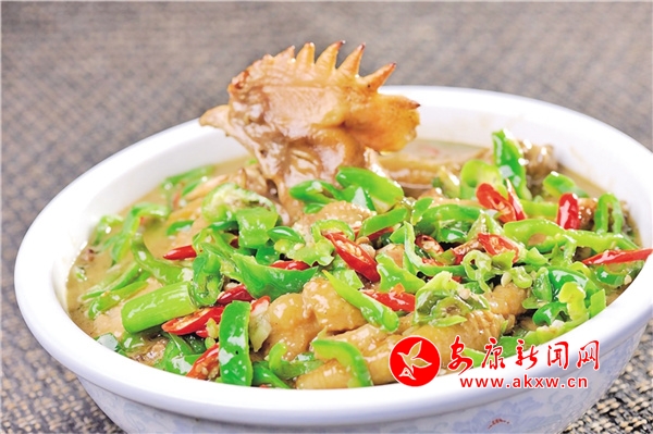 辣椒是農(nóng)家自產(chǎn)的時(shí)蔬,魚是嵐河水孕育出的鮮魚,皆是原生態(tài)無公害食品。一個(gè)鮮綠,一個(gè)鮮嫩,色香味美,佳偶天成。
